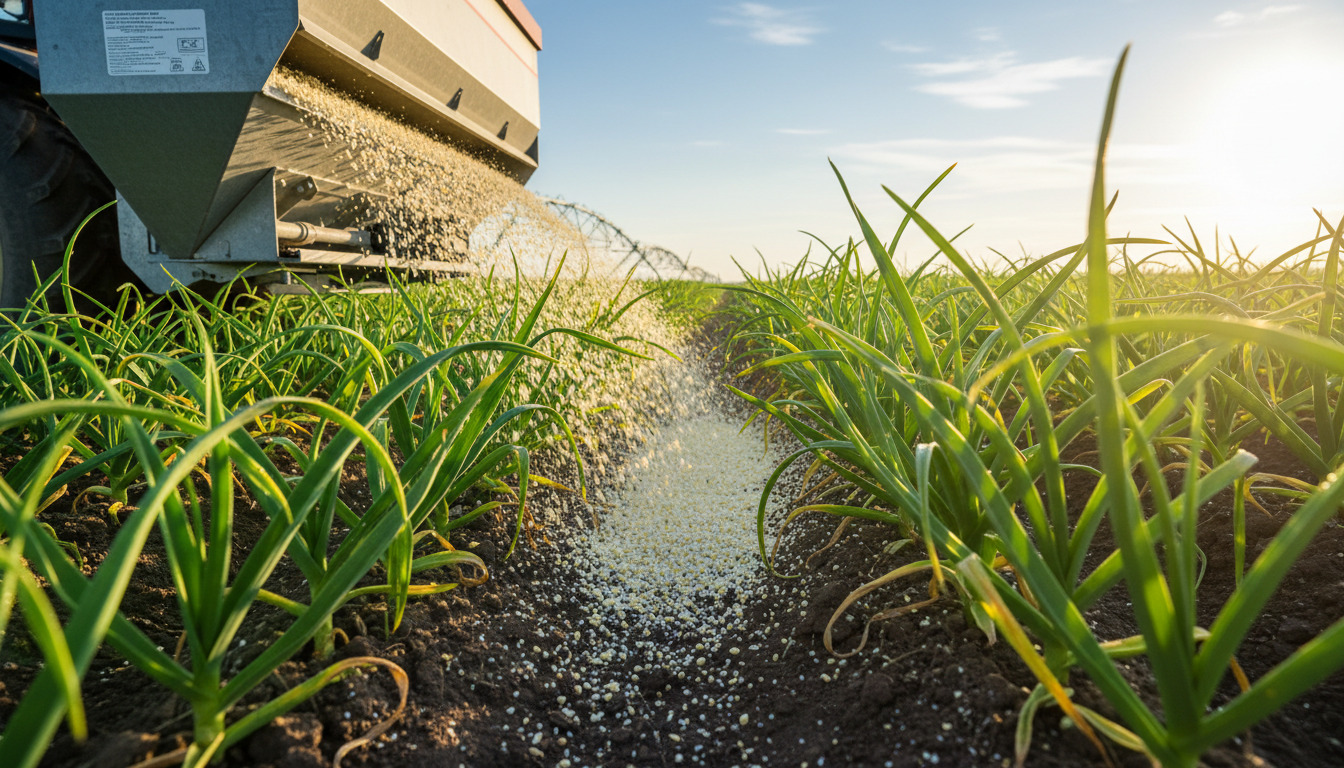 비료를 그냥 뿌려두기만 하고 물을 주지 않으면, 비료 성분이 공기 중으로 날아가거나(휘산 작용), 마늘 잎 사이에 끼어 농도 장애(비료 타는 현상)를 일으킬 수 있습니다. 비 소식이 없다면 반드시 살포 후 스프링클러나 호스로 물을 충분히 뿌려주세요. ✅