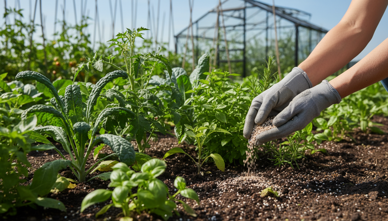 ② 10㎡(약 3평) 기준으로 완숙 퇴비 10~15kg, 고토석회 300~500g을 고르게 뿌리고 다시 한 번 잘 섞어줍니다.